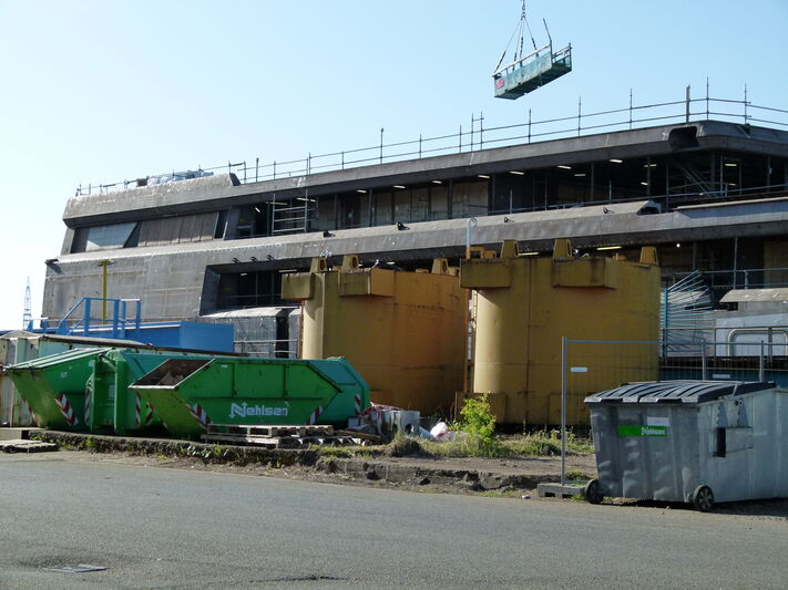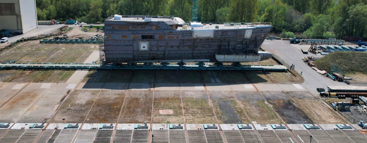 On Monday the 9th of April 2022, a 100m+ Lurssen project was spotted leaving her construction shed at the Lürssen Bremen Lemwerder facility in Germany.
