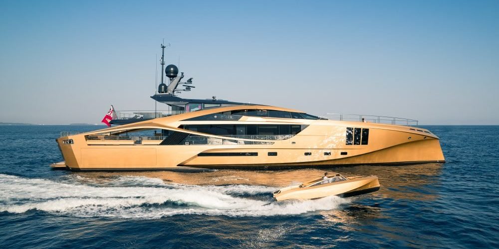 With her stunning gold finish, Superyacht Khalilah has a custom 6.8-metre (22 ft) gold tender. Her original owner designed the yacht based on their belief that “An owner should get goosebumps every time they look at their yacht.” And what better way to fulfill that than to coat the exterior of the first all-carbon Superyacht completely in gold?