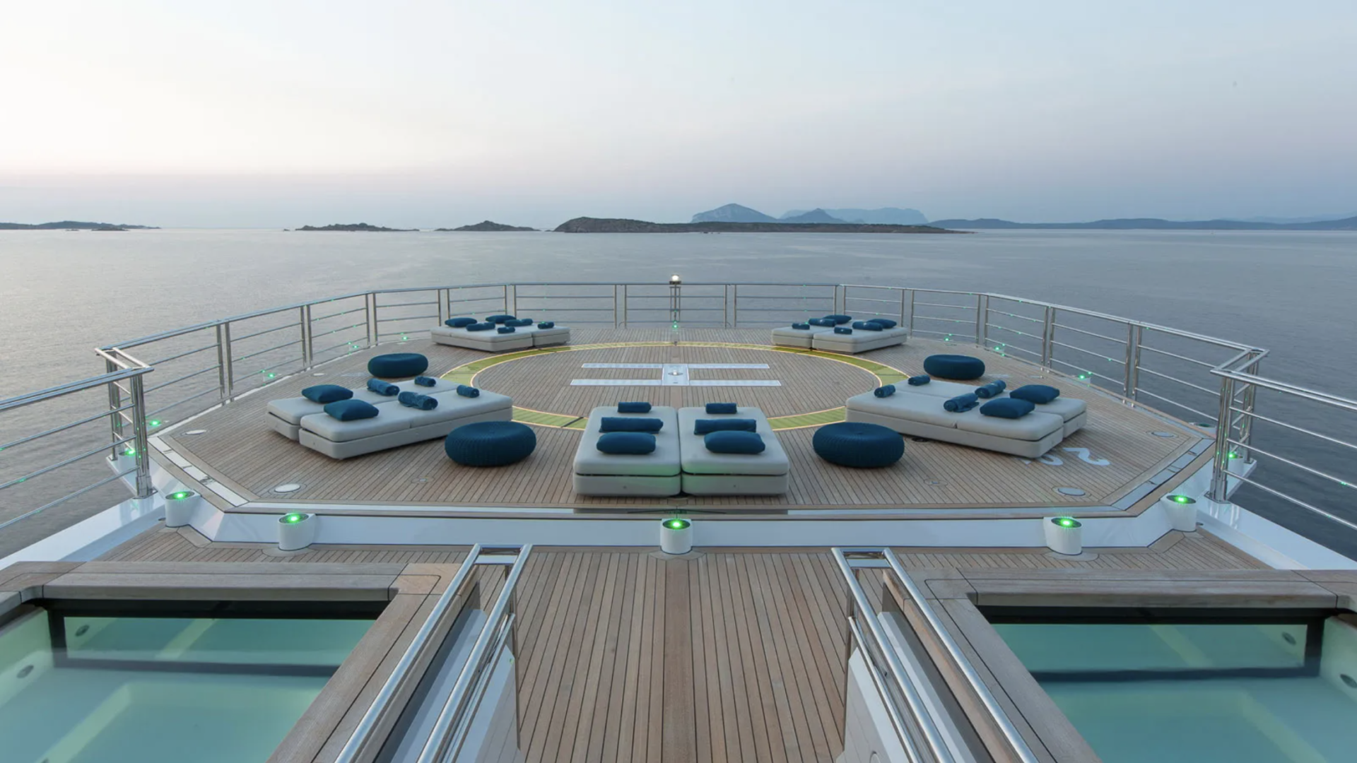 Elsewhere is the expansive sundeck and helipad, which is capable of hosting a dinner for up to 100 people. The sundeck, with its two pools and spacious lounging area, is a tranquil place for guests to relax.