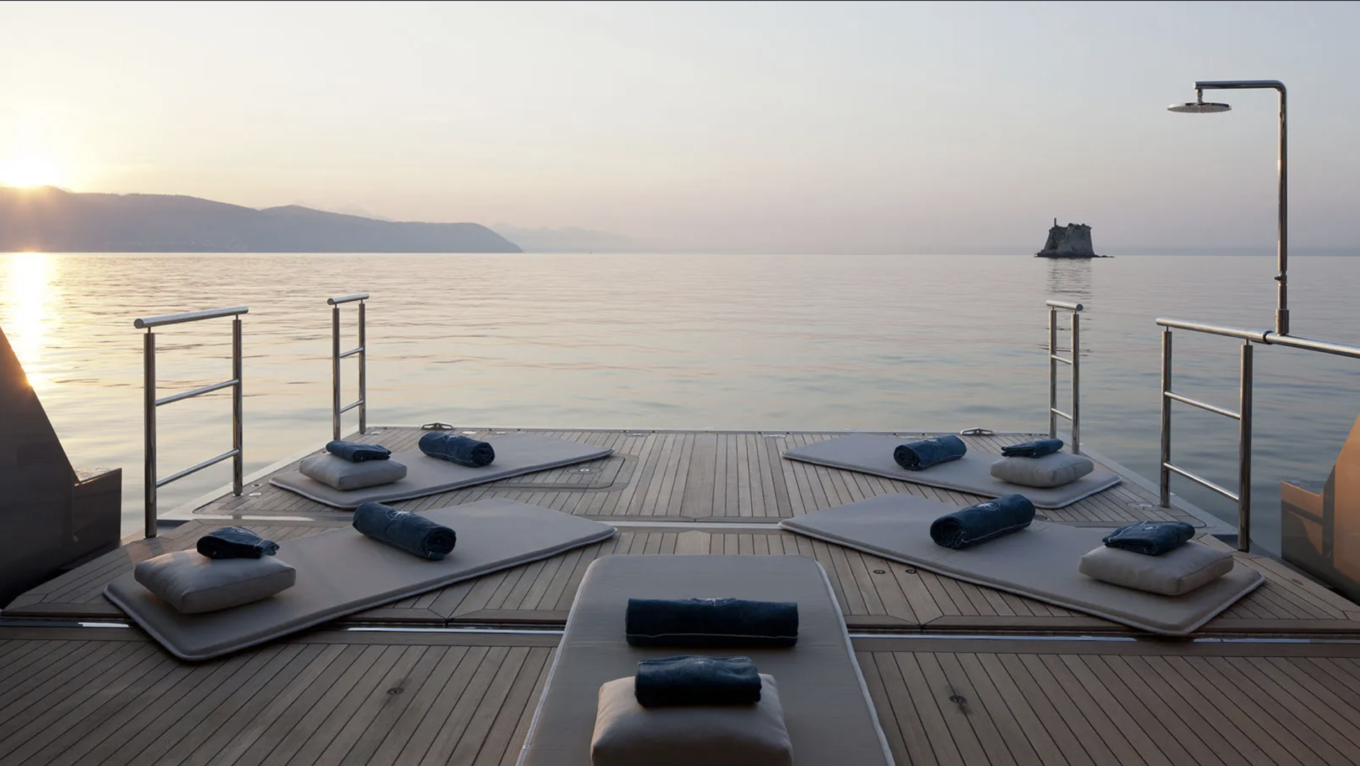 Studio Reverberi’s interior design features clean, sophisticated lines, adorned with natural stones, fabrics, and veneers. These evoke freshness, lightness, and luminosity where the indoor and exterior environments meet. These design choices continue throughout the entirety of the Superyacht. Ultimately, creating cohesion and an easy and natural flow when guests are navigating the spaces.
