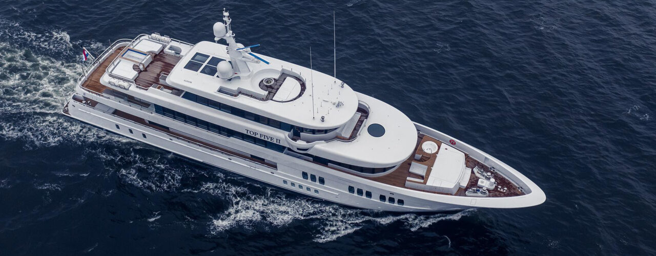 TOP FIVE II is an ocean-going motor yacht with an ice-class reinforced hull designed to explore. Her most noticeable feature is her huge ceiling heights of 2.4m on both the main and owners deck. In addition to this, she has a wealth of superyacht-standard facilities such as a swimming pool, sauna, a lift linking both decks, a large beach club, a 54″ BBQ, and lounging space on the top deck. They built her under the new IMO Tier III regulations and is the second yacht in the world to be equipped with the Naiad total ride system.