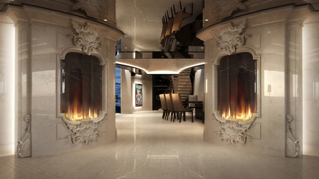 Notable features include a helipad, beauty salon, spa, sauna, swimming pool, indoor and outdoor cinemas, dance floor, gym, and elevator. Additionally, there will be plenty of space for various tenders and toys, like a sailing dinghy, Sea Bobs, sea scooters, windsurfers, and a submarine.