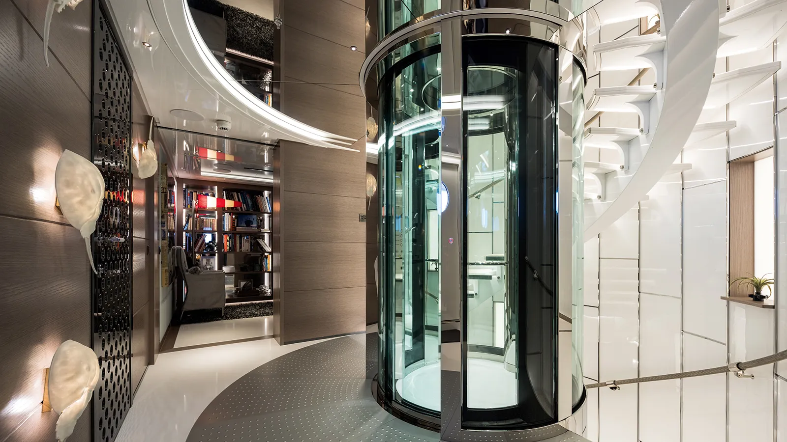 - The main deck aft has sliding glass walls that create a winter garden, with overhead heaters if required
